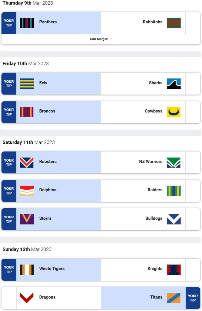 So Round 1 has come and gone, the Storm’s Round 1 streak makes it to 22 years, crowds and ratings are up by double figure percentages, and much to my surprise I actually got 5/8 instead of 4/8, as it turns out I did indeed pick Souths instead of Cronulla, so I was on for a 7/8 instead of a 6/8 before the upsets to the Queenslanders on Sunday left me with the time-honoured 5/8.