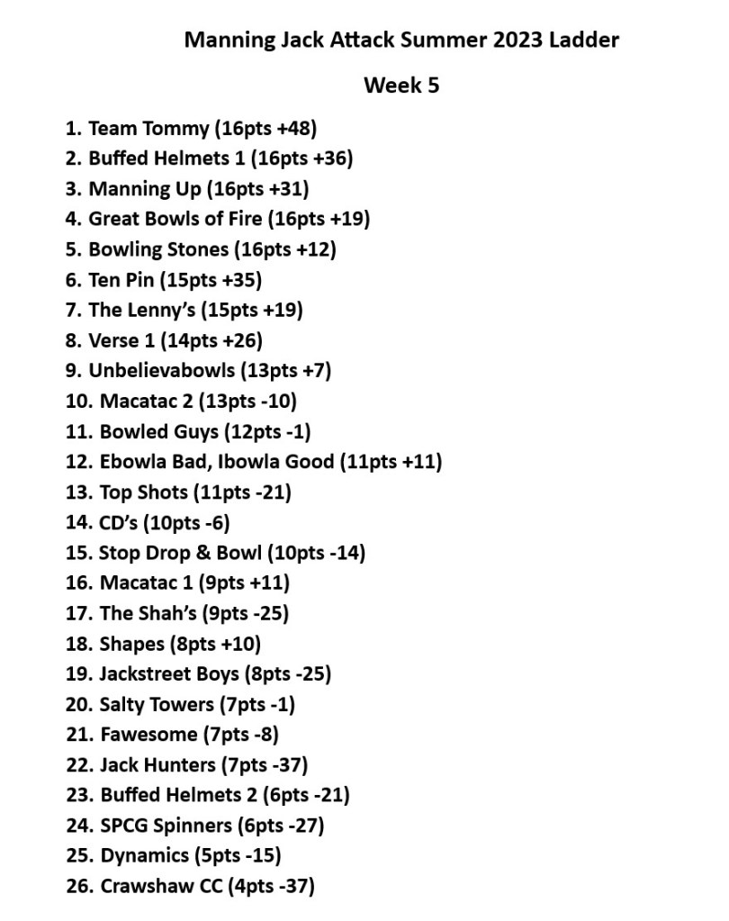 In golf, people traditionally describe Round 3/Saturday at any tournament to be ‘Moving Day’, which is a term that also applies to Week 5 at Manning Jack Attack, because it’s the last chance for hopeful teams to get themselves in the Money Games (Typically 1st through to 6th) taking place in Week 6, when the Greatest Social Bowls Competition between Manning Road and the Canning River reaches its climax.