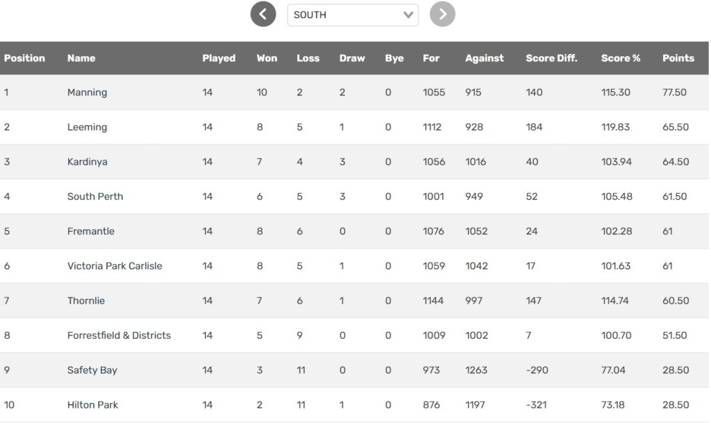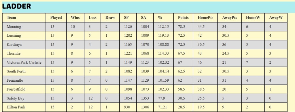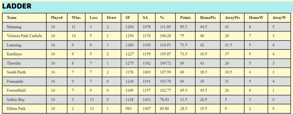 Which means Manning are now clear by 10.5 points instead of 12, because Victoria Park-Carlisle, who smashed Hilton Park 8-0 (101-53), jumped from 5th up to 2nd, with 2nd, 3rd and 4th now split by just 1.5 points, and to make it more interesting, Vic Park and Kardinya playing each other in Round 17 at Vic Park, and Leeming will play Safety Bay at Leeming, which means someone’s going to be pushing crap uphill in the Challenge Final race when we get to Round 18.