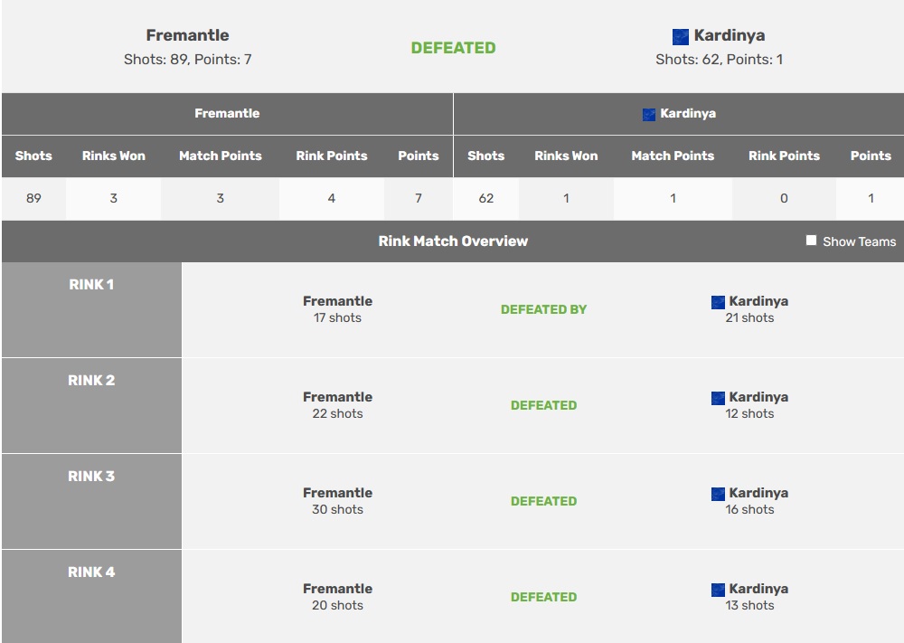 In a similar manner, Kardinya were well beaten 89-62 at Fremantle to pick up just 1 point, which can be attributed to Kardy being taken off the undercover Synthetic and not handling that beautiful green down by the harbourside, and Fremantle this season have been the proverbial box of chocolates.