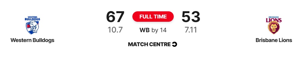 AFL The red and blue circle of parity By JTithers on March 30, 2023 • ( Leave a comment ) Melbourne defeat the Western Bulldogs. The Brisbane Lions defeat Melbourne. The Western Bulldogs defeat the Brisbane Lions. I guess it’s true what they say in Star Wars: Share This Post: Click to share on X (Opens in new window) X Click to share on Facebook (Opens in new window) Facebook Click to email a link to a friend (Opens in new window) Email Like Loading... Categories: AFL Tagged as: AFL, AussieRules, Australia, AustralianRulesFootball