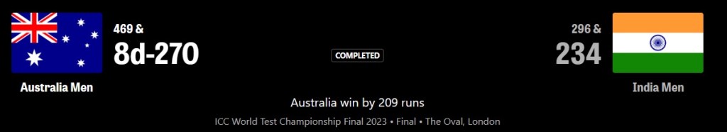 Ultimately, Australia bowled India out for 234 to win the match and claim the title.
