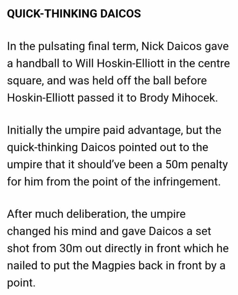 Yes, effectively Daicos and Pendlebury told an umpire he’d made the wrong decision, got him to correct it, which could the first time a player has successfully convinced an umpire to change his mind during a game in the last 125 years of football, leading directly to a goal that could cause a butterfly effect that lasts a generation.