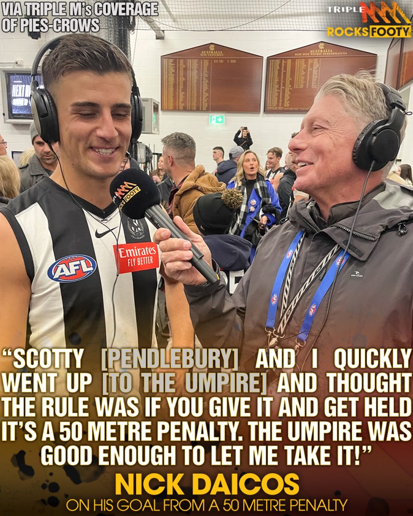 Now, fast forward to today, and there was this particular moment in the final quarter at the MCG which led to Nick Daicos getting a 50 metre penalty and goal in a game Collingwood went on to win by 2 points, doubling their winning margin over Adelaide from Round 7: