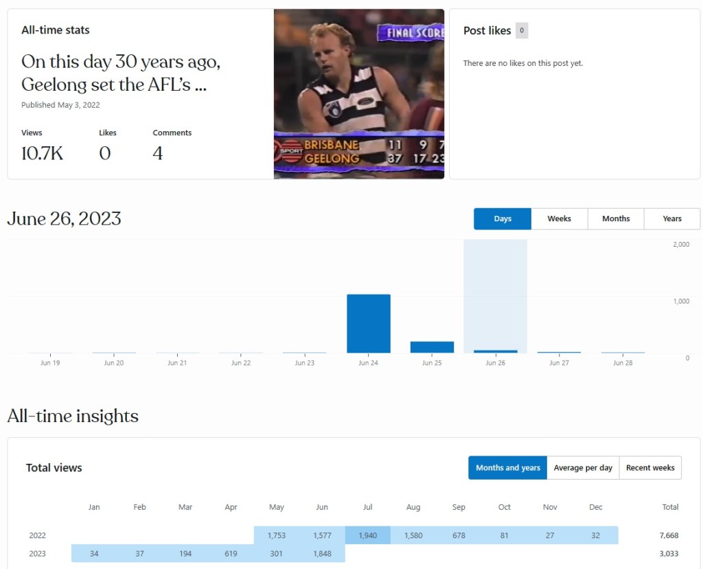 That means June 24, 2023 is now the most viewed day I have ever had in the history of this website, and it also means the Geelong AFL Record score post is now up to…