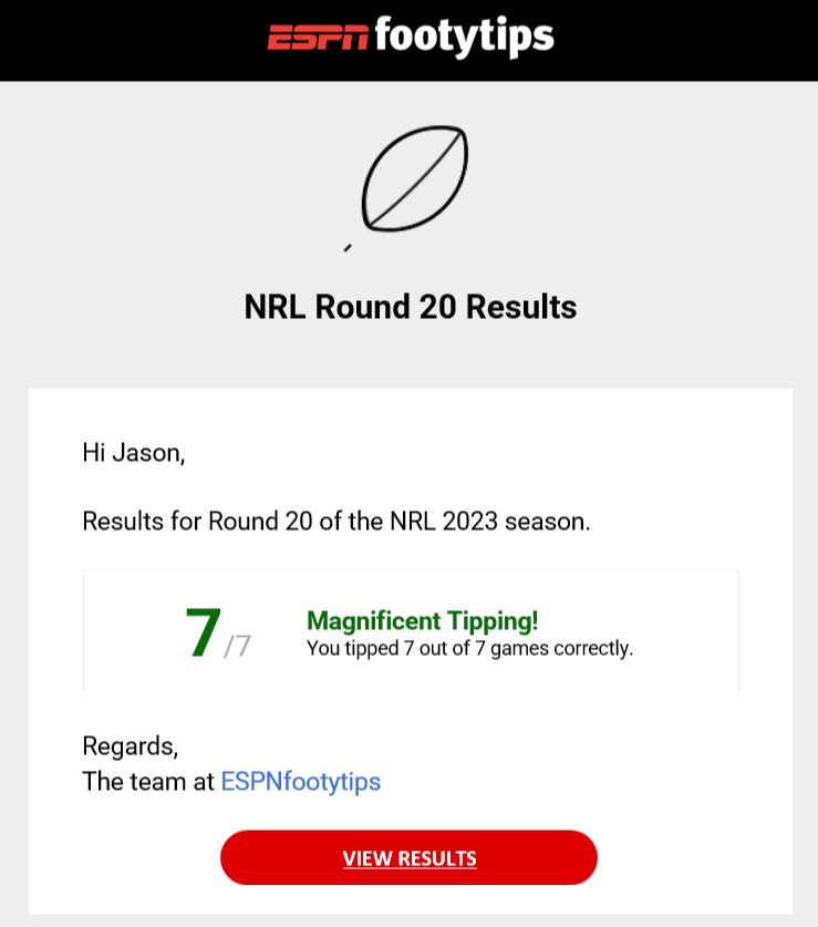 The other funny part was I checked up on the Warriors belting the Sharks and thought I’d picked Cronulla and ruined my track record… turns out I had gone for the Warriors at home, so it was as safe as the Bank of England.