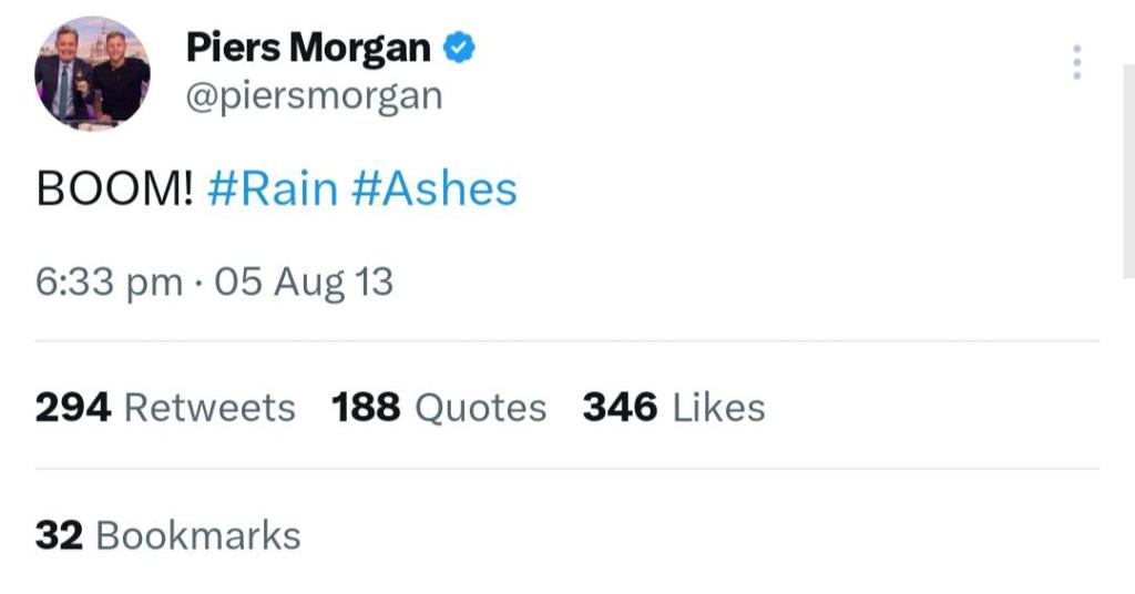 And just a reminder, 10 years ago in the lopsided 2013 series, the most shithouse Australian Ashes team of recent memory were robbed of a likely victory at Old Trafford when it started raining 20 overs into the final day, with England crumbling at 3-37 chasing 332 after Australia declared twice, allowing England to retain The Ashes with 2 Tests to play, and Piers Morgan celebrated with this: