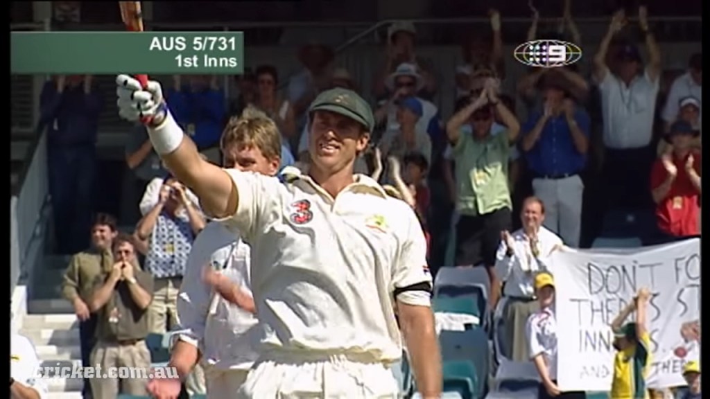 A short while later, Hayden moved to an unbeaten 334, matching Sir Donald Bradman and Mark Taylor (Who was commentating the match for Channel Nine) on the Australian Test record score, and it should be remembered Taylor had declared at Rawalpindi 5 years earlier so he could share Don’s record score…