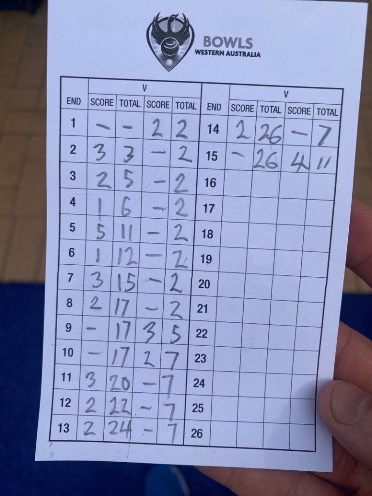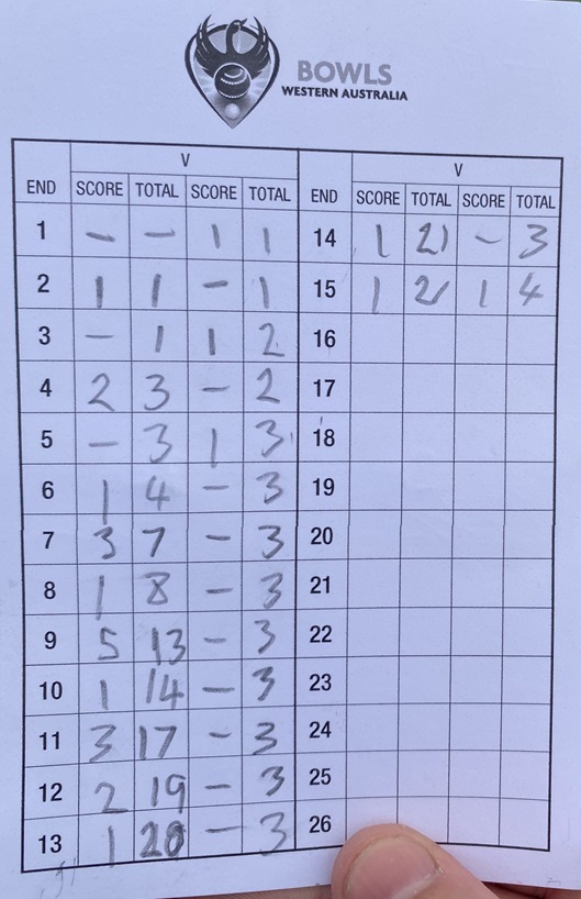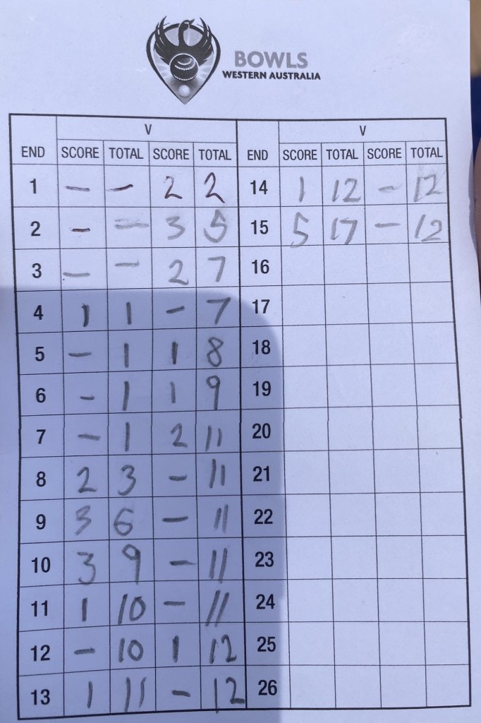 Sam’s first bowl went close to the ditch, knowing Brad would have a big drive, and Pinjarra’s finest wicked off Terry’s front bowl, but proceeded to miss the jack and whack his only bowl out of the head, so were holding 5…