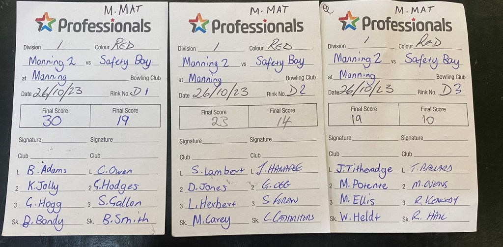 In the first game of Thursday Premier League South, the Manning Terrible Twos, managed by this idiotic author, get a 6-0 vs Safety Bay at Manning on a slow windy deck.