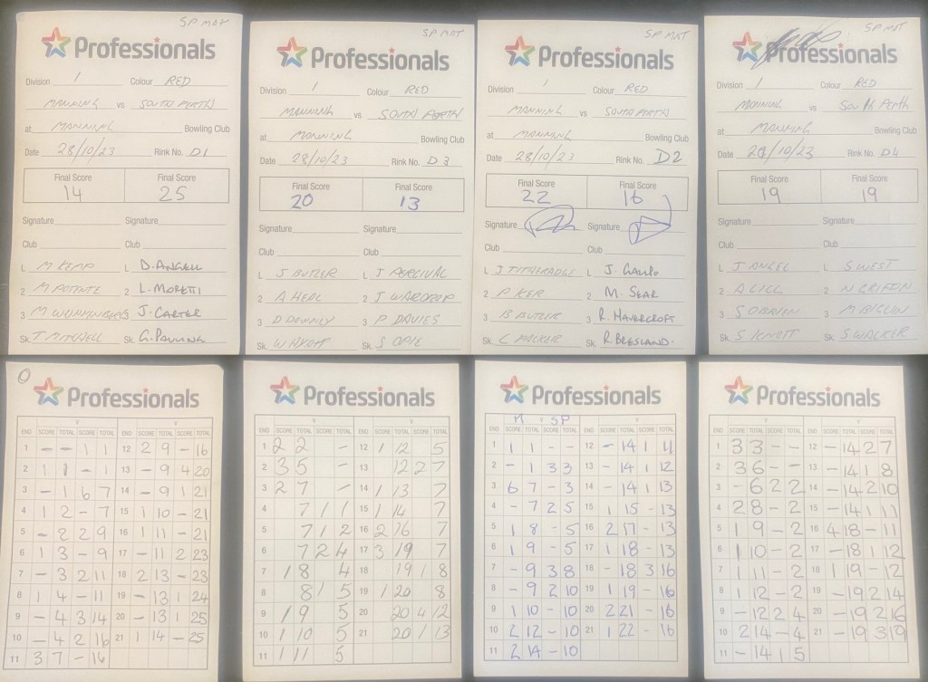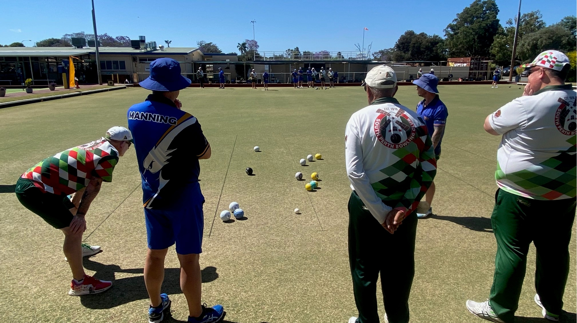The final couple of ends as PK, Blake and Cody look at the head with PK holding shot in between two South Perth bowls, with Tom Mitchell looking over and Marcus Sear standing like he’d been attacked by a mosquito.