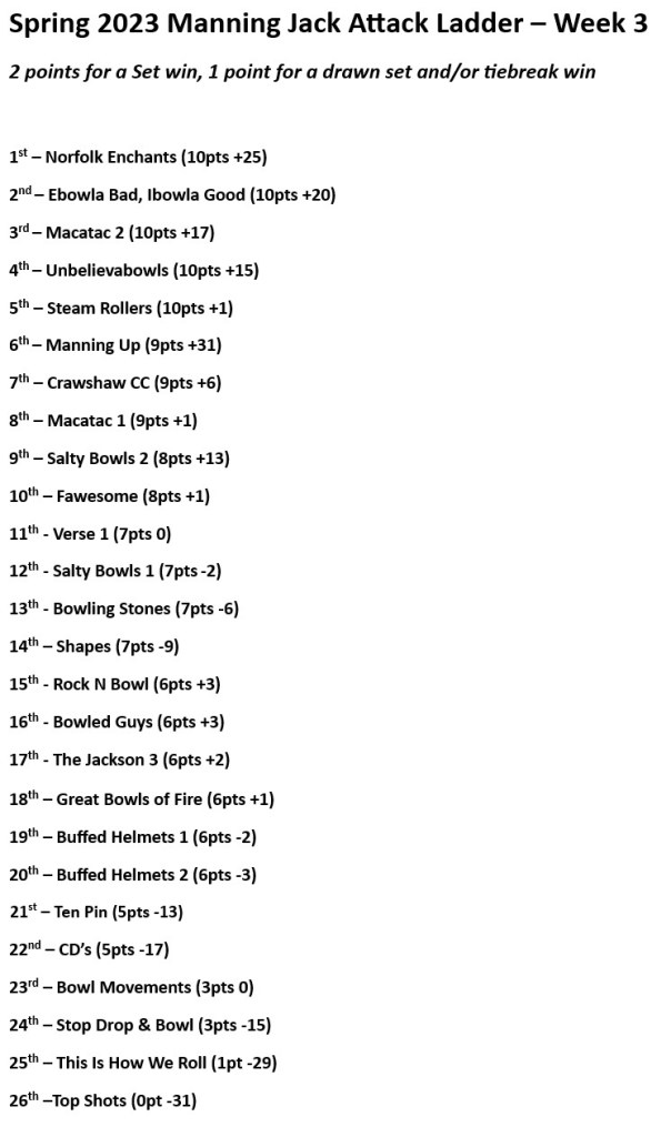 In fact, with results going their way on Wednesday night, Quinny and the Norfolk Enchanters have jumped up from 4th to sit on top of the ladder after Week 3, in this their first crack at Manning Jack Attack.