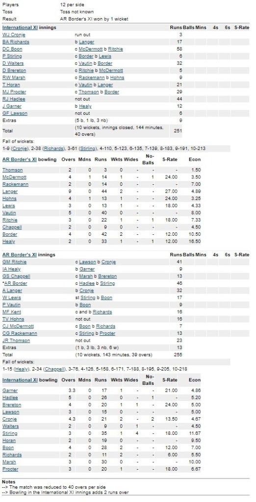 On another note, here’s the scorecard from the game – The Border XI won by 1 wicket thanks to Jeff Thomson and Trevor Hohns, and see if you can pick some of the names on the sheet: