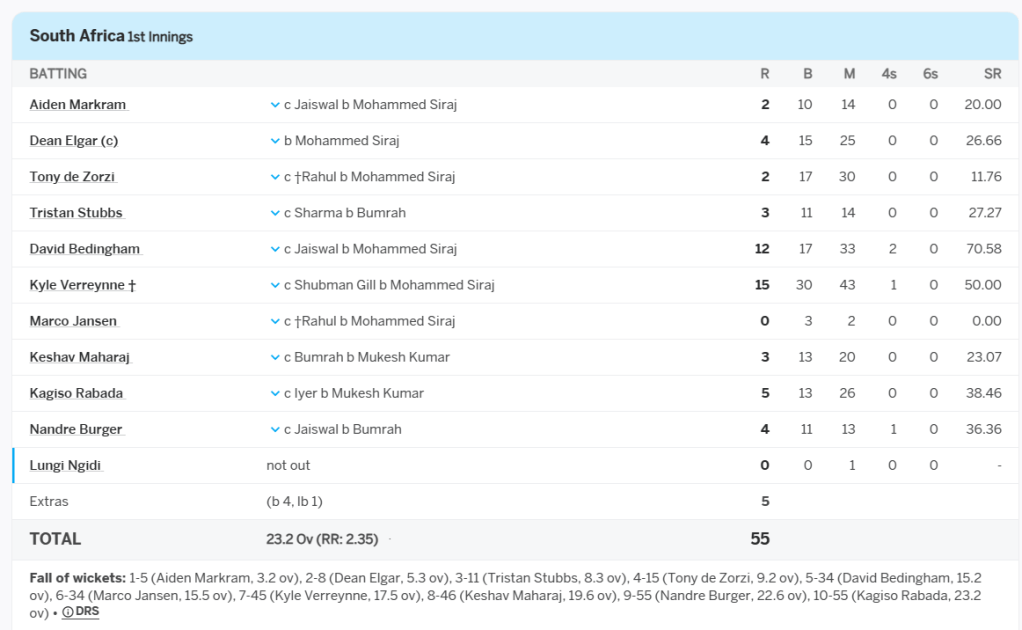South Africa were all out for 55 on the first morning against India in Cape Town, their lowest total in a Test match in South Africa since the 19th Century, a simple time when even the Zulus could bat better than the current South African team: