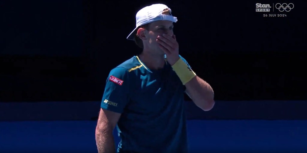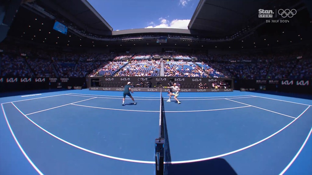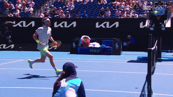 And Tsitsipas somehow reaches the ballat full speed, swats it straight to the umpires chair to win the point, all while somehow avoiding the net as if he were straddling a tight rope, with the umpire in full view giving it the all clear.