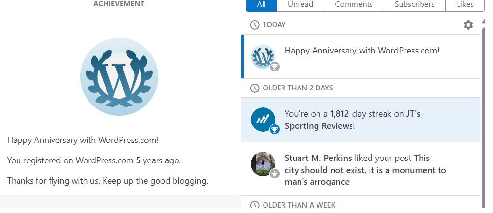 Miscellaneous Made it to the 5-year anniversary on WordPress and completely forgot about it By JTithers on February 7, 2024 • ( Leave a comment ) Go me. Share This Post: Click to share on X (Opens in new window) X Click to share on Facebook (Opens in new window) Facebook Click to email a link to a friend (Opens in new window) Email Like Loading... Categories: Miscellaneous Tagged as: Australia, Birthday, WordPress