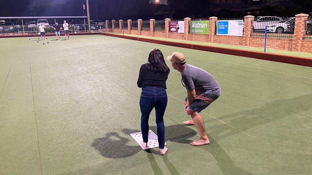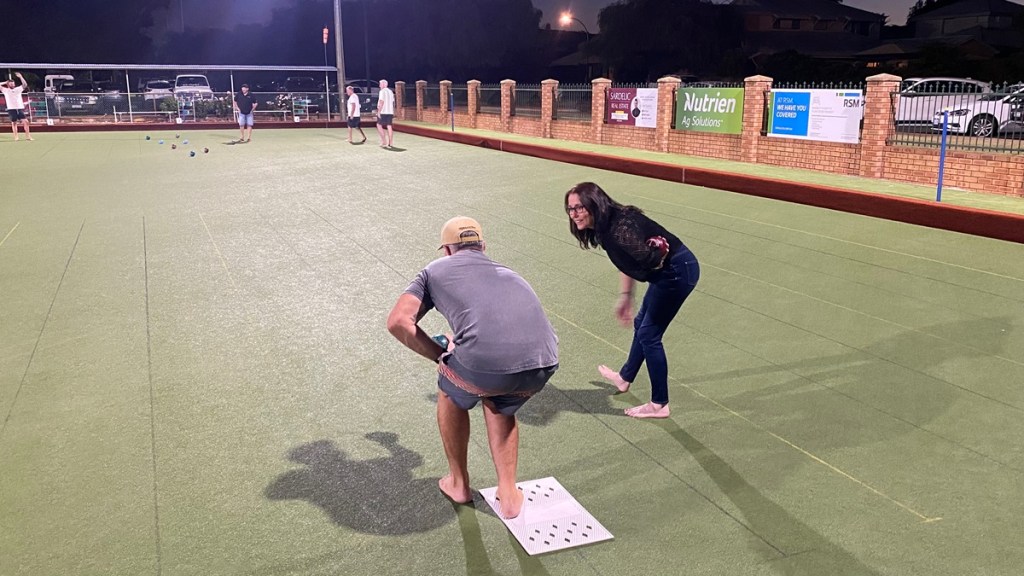 In what seemed to be a pattern, the second tiebreak occurred next door on Synthetic Rink 6 between Rock N Bowl and This Is How We Roll, following on from a high-scoring pair of sets (12-8 to How We Roll in the 1st and 11-4 to Rock N Bowl in the 2nd), and eventually Rock N Bowl got the win in the decider, and it was a good debut for Jodie playing alongside Belinda Mac and Cam, and before the night began Adam Mac was giving Jodie some coaching…
