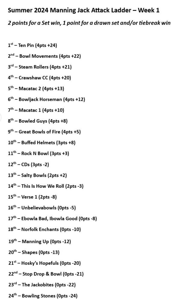 2nd overall went to the Bowl Movements, who recorded a straight sets +22 shot win against debutants The Jackobites on Synthetic Rink 2, a game that would also feature a full count of 6 (12) on a final end powerplay, catapulting Bowl Movements from a midfield start up into 2nd place after Week 1.