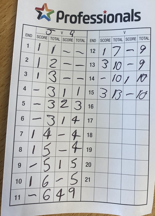 I felt glad to see that, because my rink (with Cody Packer as skip) went from being 11-3 up to losing 13-25, so you’ll expect to see dropped back to Division 1 White on Saturday.