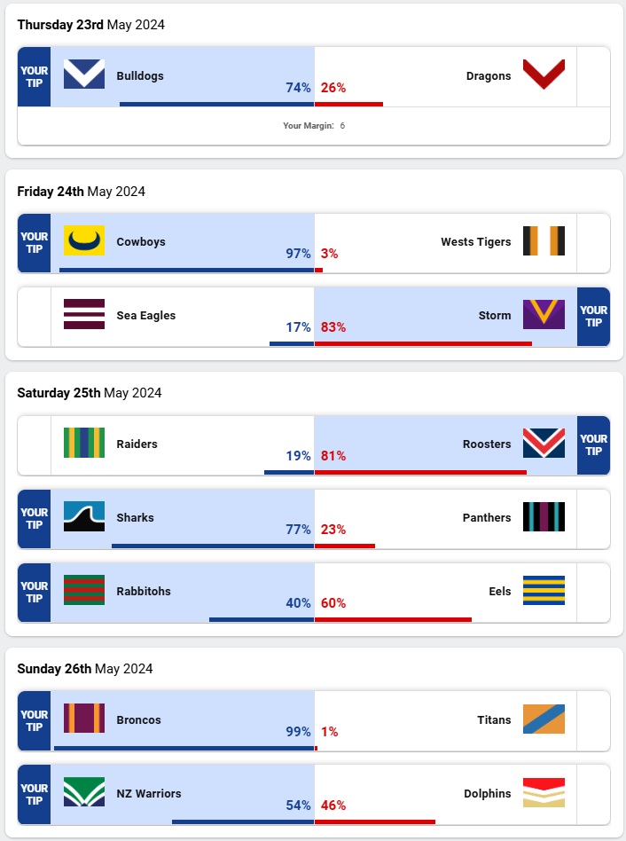 I also had a look at my results compared to this time last year, and thanks to Magic Round last weekend, I am 2 correct tips better off this year (56 vs 54).