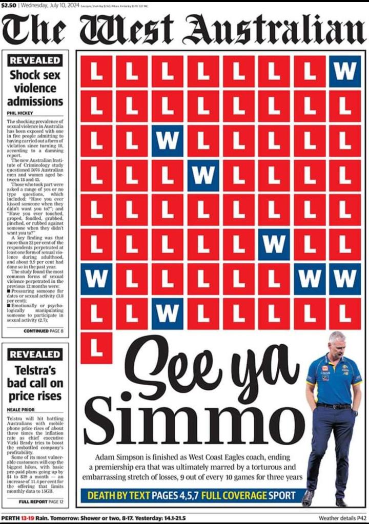 Which was followed by the West’s utterly shithouse front page about Simpson, who coached a damn premiership for the Eagles, coming courtesy from their back page glass-jawed wankers Jaked Waddell and Mitchell Woodcock, better known as Cockwood or Wood Dick.