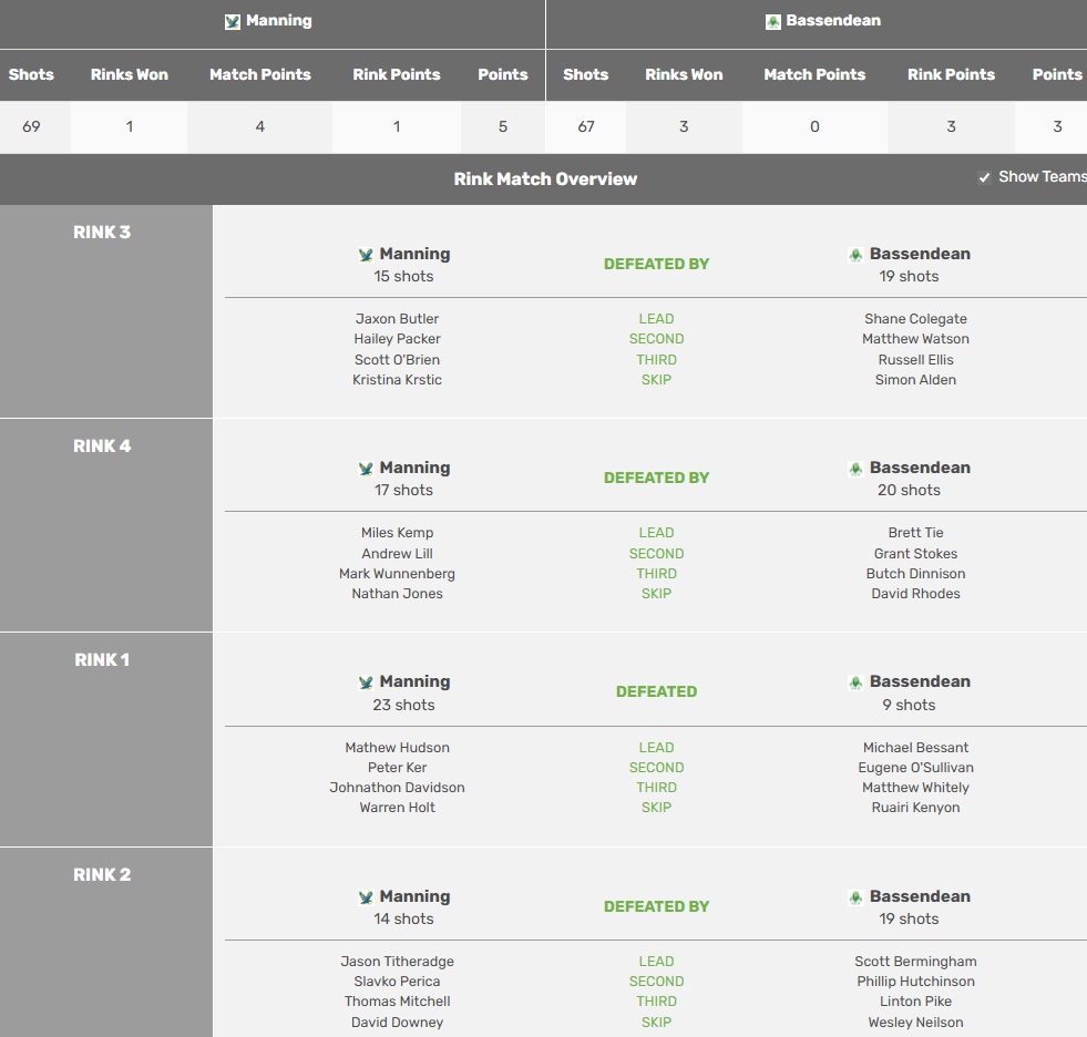 84th End against Bassendean: Down 1 on the aggregate, Jono Davidson drew shot to tie the aggregate on the live board, both skips (Holty & Ruairi Kenyon) missed on their first bowls, but Holty corrected and played a forehand bomb, getting through a two foot-wide gap and sitting out second shot to make 3, and Ruairi couldn’t change the head with the last bowl of the day, giving Manning the aggregate.
