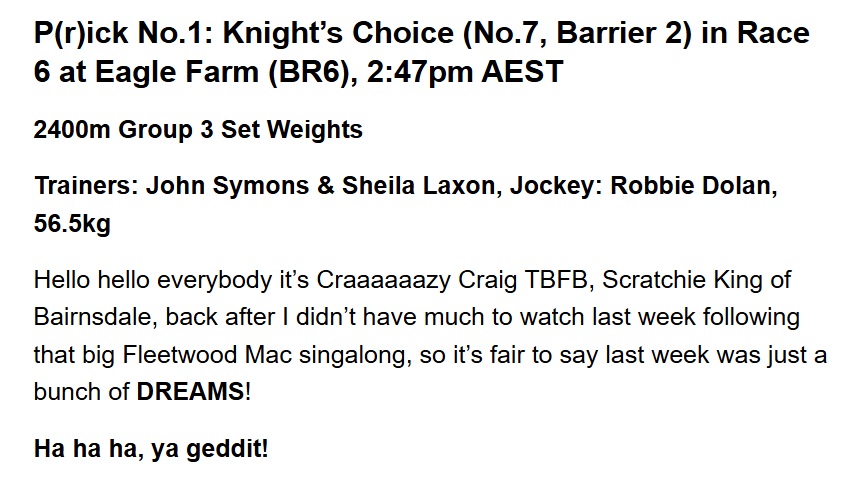 So that means in the last 2 years, he’s picked Without A Fight (Who won on June 10, 2023) AND Knight’s Choice during the Queensland Carnival, and promptly forgot about both of them as they went on and won the Melbourne Cup.
