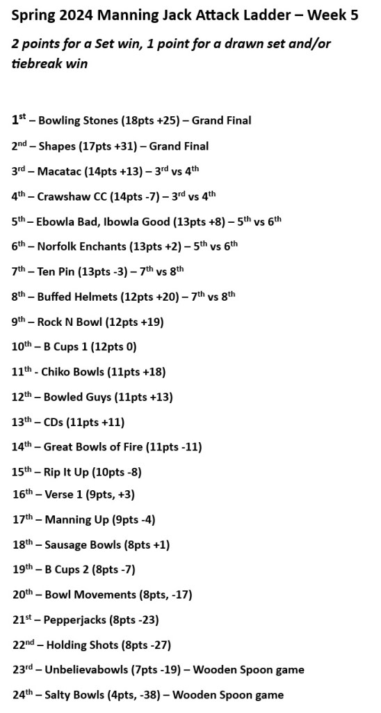And the other important game next week will be the Wooden Spoon game, and this season’s contestants will be the aforementioned Unbelievabowls, who finished in 23rd having picked up all of 3 points in 4 games since their Week 1 straight sets win, and in last spot is the winless Salty Bowls, who did double their season points tally in Week 5, but lost to the Pepperjacks in a tiebreak in a duel of the cellar dwellers, and there was an interesting scenario that if the Salty Bowls had won that tiebreak (And remained in 24th), the Pepperjacks would’ve been 23rd on the ladder and the teams would be playing again next week, although it’ll simply go down as a what if.