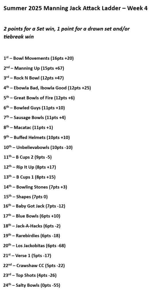 An unfortunate result for the Stones, who are still up in 14th despite not winning a game, having lost 3 tiebreaks out of 4 games, making them a shoe-in for the Merv Roberts World’s Unluckiest Bowlers Award, which will be present by Merv via satellite from Vietnam.