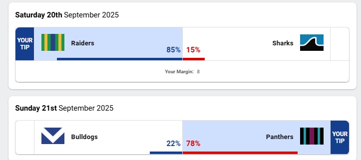 – Desperate to avoid becoming another fabled victim of the 50-point curse with a straight sets exit, the Canberra Raiders host the Cronulla Sharks in the nation’s capital off a 6-day break, which will be the fourth time since 2010 that the teams have played a final in Canberra (2012, 2016, 2020 + 2025) and fun fact – Heading into this game the all-time H2H is dead level at 42 wins apiece!