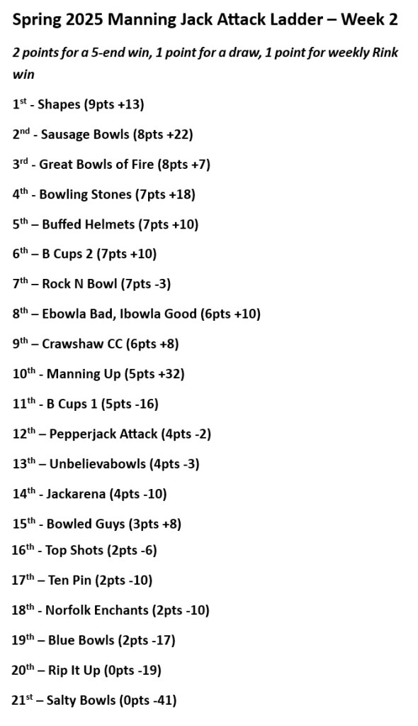 The first Spider Challenge for Spring 2025 wasn’t one of the greater looking efforts, mainly due to the jack being shot towards Rink 3 after everyone had bowled, and I did notice there was an illegal blue bowl delivered 10 seconds after the whistle in the hopes of gaming the system…. but the bowl was so bad that it sailed through and finished in the ditch.