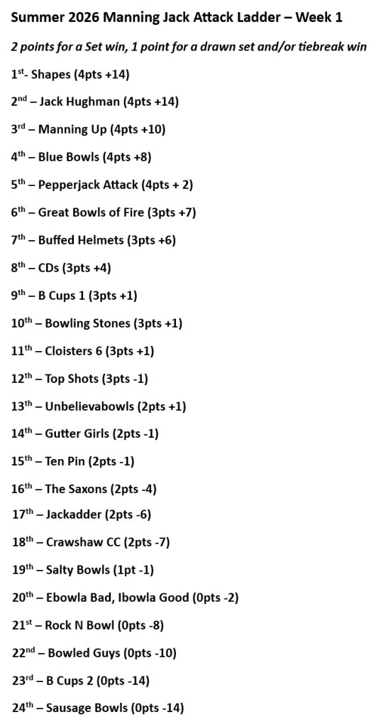 Then with the game on the line, Todd completely ignored the incorrect advice of Jonesy and switched to a backhand drive and smashed the jack out of the bounds to get the respot, which Peter from Crawshaw couldn’t beat, and the Great Bowls finished Week 1 in the Top 6, a great start to the 10th Anniversary season for the second-longest tenured team in Manning Jack Attack.