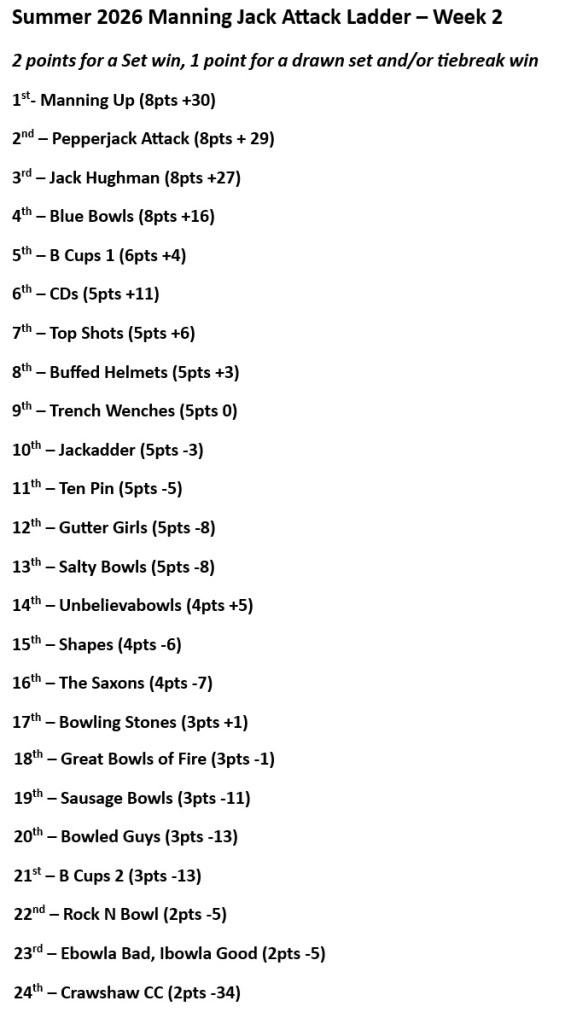 Week 2 marked the first of the Spider Challenges for Summer 2026, and our new teams had a brutal start to the great novelty challenge when big Macca (Who was filling on Pepperjack Attack and SUPPOSEDLY bowling left handed) decided to bowl right handed and fire a full blooded drive which got the jack square and shot it to the overflow carpark, which took out 98% of the field as they all aimed at the centre where I’d spotted the jack…