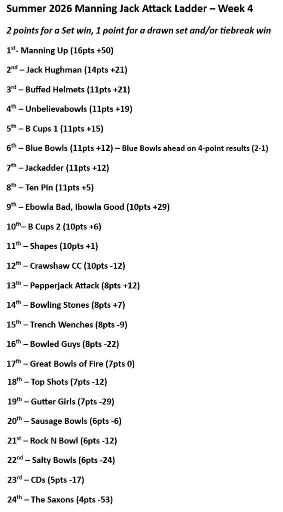 3rd Overall went to Grand Final bound Manning Up, who clearly haven’t forgotten that Grand Final they lost to the Great Bowls of Fire in 2022 as they defeated Todd, Jonesy and Alphabet in straight sets by 9 shots (11-1 5-3) on Grass Rink 3, and despite having 2 players out, team micromanager John once again wasn’t required to bowl, thanks in part to Mitchell Trophy candidate Fabulous Phil delivering another rock solid performance alongside Brent and Trav, as they whipped the Great Bowls 11-1 in the 1st Set, but the 2nd Set wasn’t as clear cut, with the Great Bowls leading 3-0 after 3 ends, only for Manning Up to get the shot on the 4th End, and with their customary last end powerplay, needing 1 shot to seal the game, Brent and Trav went one better and got him 2 to make 4 and win the 2nd Set outright, which also means Manning Up have made more history – They are the first team in the history of Manning Jack Attack to qualify for a Grand Final before Week 5.